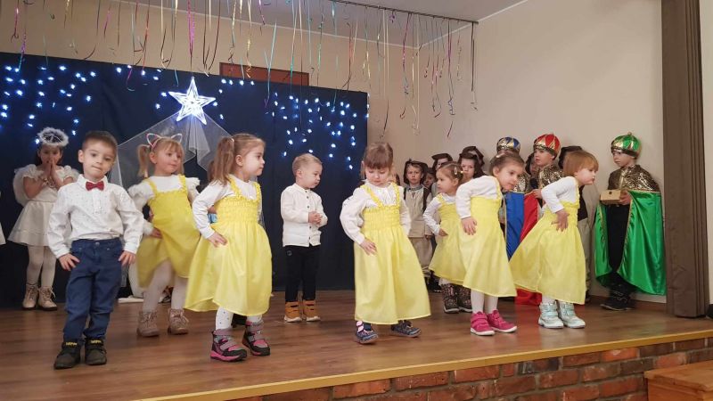 Okres Świąt Bożego Narodzenia, to czas pełen radości. Czas spełniania marzeń i okazywania sobie wzajemnie miłości. Aby podkreślić wyjątkowy charakter tych świąt, dzieci z zerówki A postanowiły zrobić miłą niespodziankę świąteczną i wszystkich wprowadzić w atmosferę Świąt Bożego Narodzenia wystawiając Jasełka. Mali aktorzy, we wspaniałych strojach prezentowali się doskonale na tle bożonarodzeniowej dekoracji – stajenki z Józefem, Maryją i Dzieciątkiem. Mali artyści z dużym przejęciem i zaangażowaniem wiernie odtwarzali swoje role, prezentowali umiejętności recytatorskie i wokalne. Na końcu pani dyrektor złożyła życzenia wszystkim zebranym, a potem dzieci usiadły przy pięknie przystrojonych stołach, na których czekał świąteczny obiad. Nie zabrakło na naszym stole smacznego barszczu, ziemniaków z rybą oraz kapusty z grochem. Całe nasze przedszkole wypełniał nastrój pełen dziecięcych uśmiechów, radości i życzliwości.